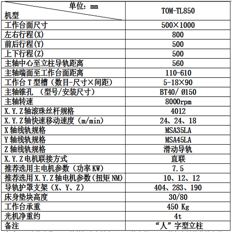 4、X、Y轴导轨为负载能力强、运行平稳的线性滚珠导轨,导轨副磨擦阻力小,因而机床在低速进给时无爬行;Z轴为滑轨,与导轨相结合的主轴箱导轨均采用耐磨贴塑处理,降低了导轨间的动静摩擦阻力,在低速进给时无爬行,高速进给时振动小,提高了机床的运动精度。